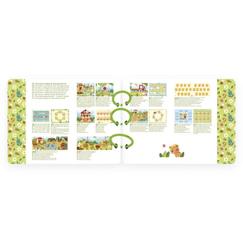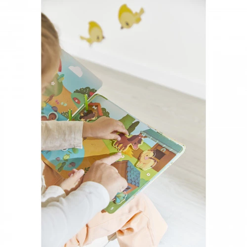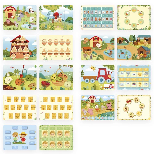 Account aanmakenWelkom op de boerderij! Dit activiteitenboek, met 20 pagina's vol activiteiten, laat peuters vanaf 3 jaar kennismaken met het leven op de boerderij. En er is zoveel te beleven! Dieren dartelen in de weilanden, kuikens komen uit het ei, groenten groeien in de zon… Kinderen hebben duizend dingen te ontdekken! Ze vinden alle sterdieren van de boerderij: de kip, de koe, het varken, het konijn… en zelfs de kalkoen! Terwijl ze de pagina's omslaan, leren kinderen hun leefomgeving kennen en zien ze scènes uit het dagelijks leven. Elke activiteit stimuleert manipulatie, observatie en benoemen, waardoor leren leuk wordt. In totaal zijn er 158 onderdelen om in het boek te plaatsen! De zachte en levendige illustraties zijn ontworpen om de nieuwsgierigheid te prikkelen, de woordenschat te verrijken en de fijne motoriek te ontwikkelen. En dat is nog niet alles: oudere kinderen kunnen ook leren over cijfers en het alfabet, zowel hoofdletters als kleine letters. Een echte stimulans voor de taalontwikkeling en de eerste schoolvaardigheden. Dit praktische en aanpasbare activiteitenboek is gebonden met drie afneembare plastic ringen, waardoor ouders de pagina's kunnen kiezen die het beste passen bij de leeftijd en het tempo van het kind. Een fantastische manier voor kinderen om met hen mee te groeien! Dit leerzame speelgoed is perfect voor zelfstandig spelen. Dankzij het boekformaat is het gemakkelijk overal mee naartoe te nemen! Afmetingen: 27 x 21 cm. Dit activiteitenboek is gemaakt van FSC™-gecertificeerd karton. Laat de ontdekkingstocht beginnen!