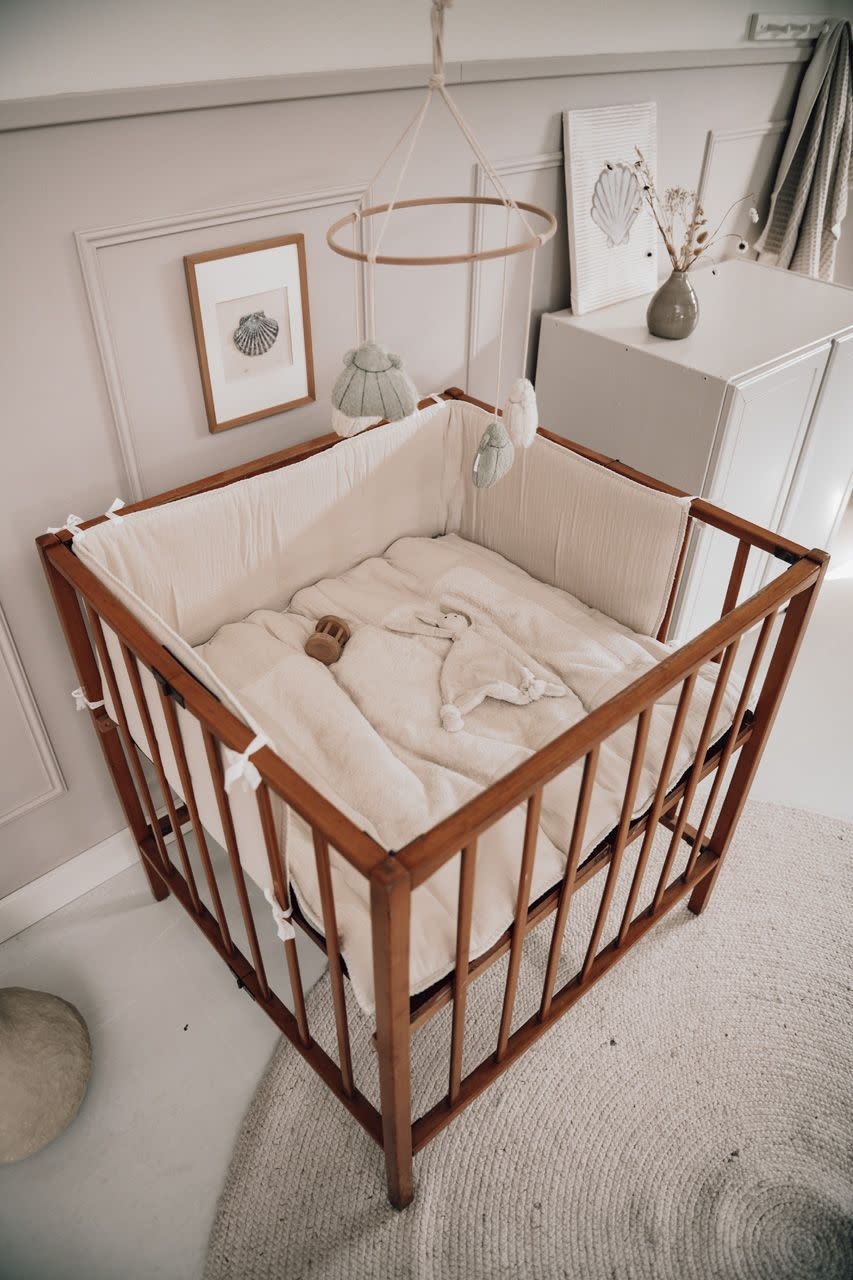 Account aanmakenDe box staat meestal in je woonkamer en daarom is het mooi als je de box accessoires qua kleur en stof kan afstemmen op je interieur. Het belangrijkste aan deze boxbumper is uiteraard de bescherming tegen tocht en tegen het stoten aan de spijlen van de box. Je kunt de bumper gemakkelijk aan de spijlen van de box bevestigen met de daarvoor bestemde koordjes. Er zitten meerdere bevestigingskoordjes over de gehele breedte van het kussen zodat hij goed verdeeld en vastgestrikt kan worden.
