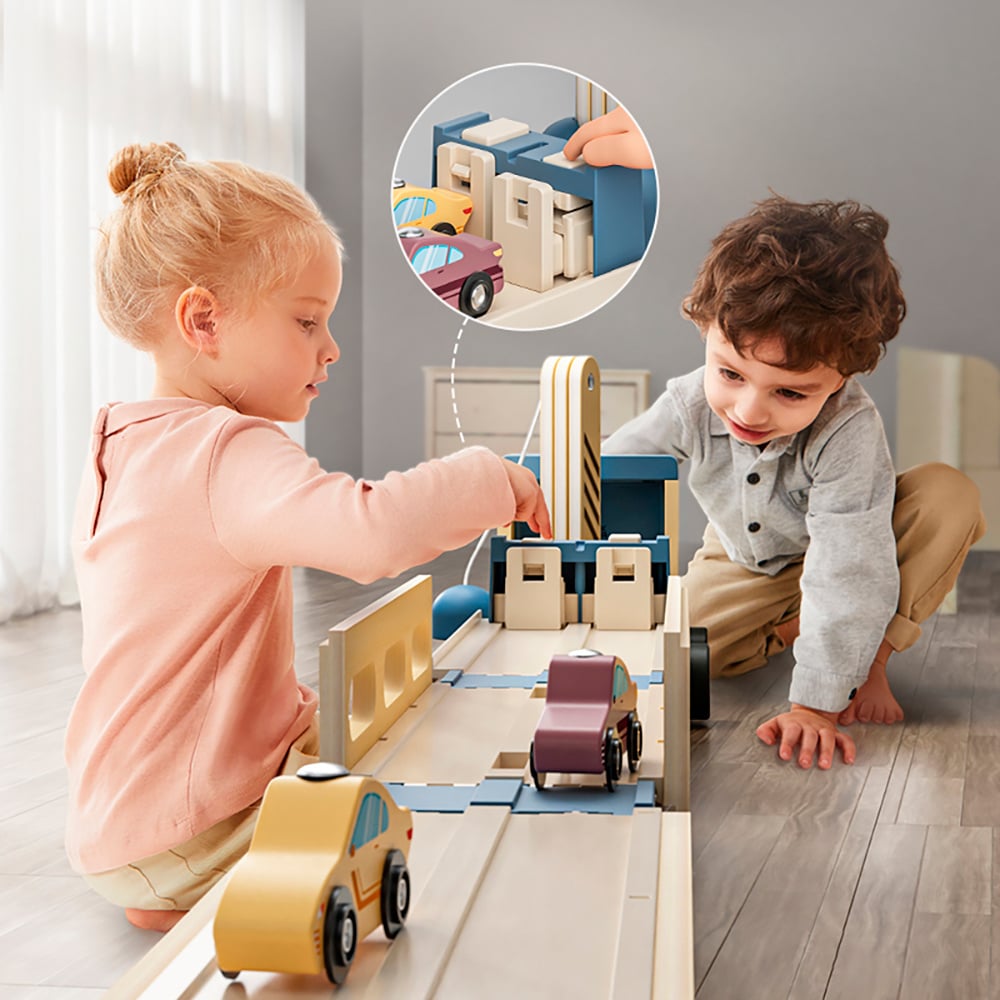 De Roll & Race Autotransporter van TOPBRIGHT combineert alles wat kleine autofans van 36 maanden en ouder zal bekoren. Het is niet alleen een coole autotransporter, maar ook een spannende racebaan. De verplaatsbare transporter biedt plaats aan acht kleine auto's op twee niveaus. In een paar simpele stappen verandert de houten autotransporter in een 103 centimeter lange racebaan met twee banen, die kinderen uitnodigt om deel te nemen aan snelle autoraces. Of ze nu alleen zijn of samen met familie en vrienden - kinderen plaatsen de auto's op de startbaan, drukken op de startknop en de auto's racen over de baan. De autotransporter stimuleert de fantasie van kinderen en nodigt uit tot vrij spel: acht auto's, twee racebanen, een coureur en een magnetische kraan - en de autorace-ervaring is compleet. Kinderen worden creatief en verzinnen spannende verhalen over de 2-in-1 autotransporter. Na het spel kunnen de kleine auto's op de twee niveaus worden opgeborgen. Zo blijft de kinderkamer netjes en kan de volgende speelsessie snel beginnen.