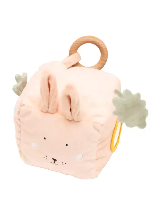 Zacht, leuk om in te knijpen en vol boeiende verrassingen. Deze activiteitenkubus met een lief gezichtje belooft uren ontdekkingsplezier. Hij heeft verschillende texturen, pootjes, een staart, een spiegeltje, een knisperende vulling en een houten én silicone ring. Perfect om op te kauwen en om hem te dragen.