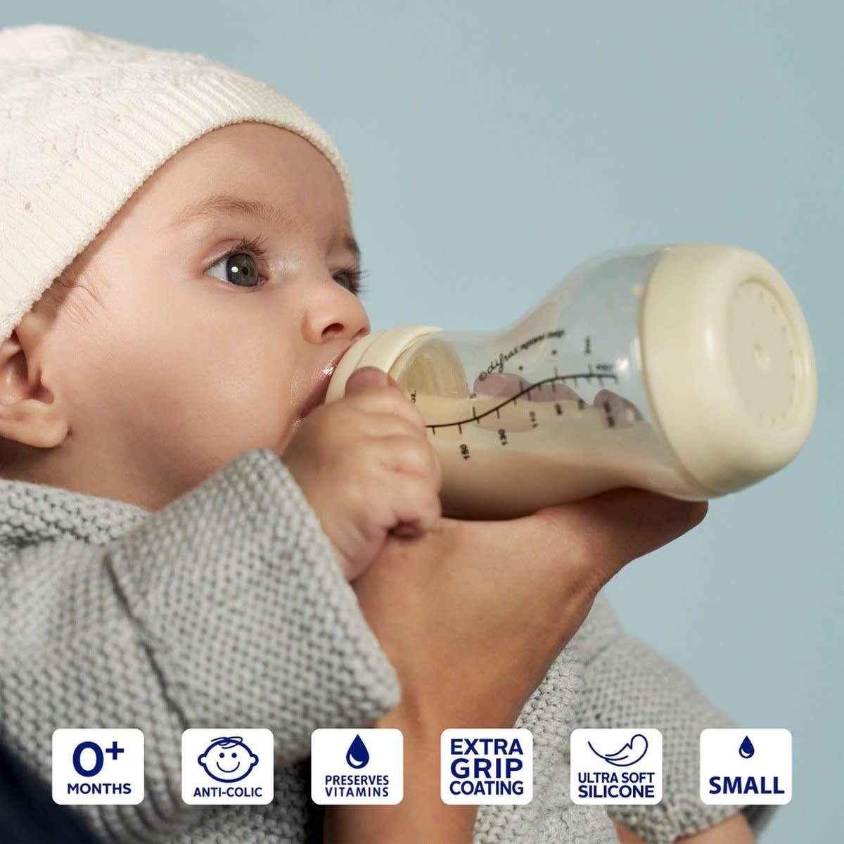 - Het speciale anti-darmkrampjes ventiel en de S-vorm zorgen voor een constante stroom van flesvoeding.