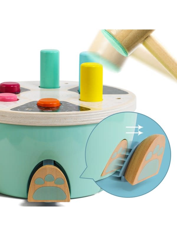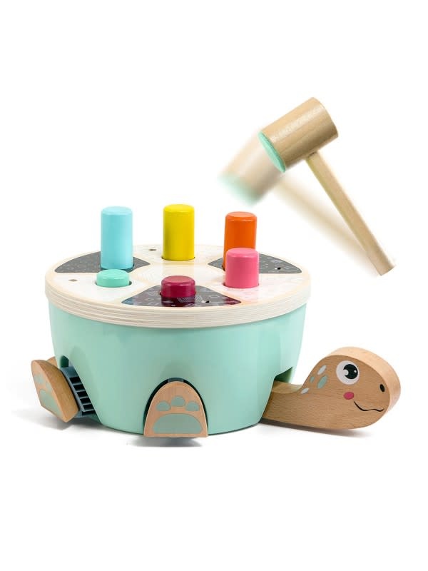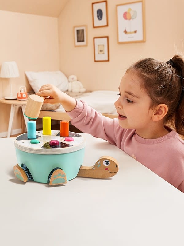 Je kindje slaat eenvoudig de gekleurde staafjes in het hamerbankje met het houten hamertje dat wordt meegeleverd. Als je kindje slaat op de gekleurde staafjes, komen de komen de pootjes, het kopje en het staartje uit het schild van de schildpad. Het hamertje is gemakkelijk vast te pakken door je kindje. De slagkant van het hamertje is bedekt vilt, hierdoor worden de geluiden gedempt als je kindje slaat op de staafjes, wel zo prettig!